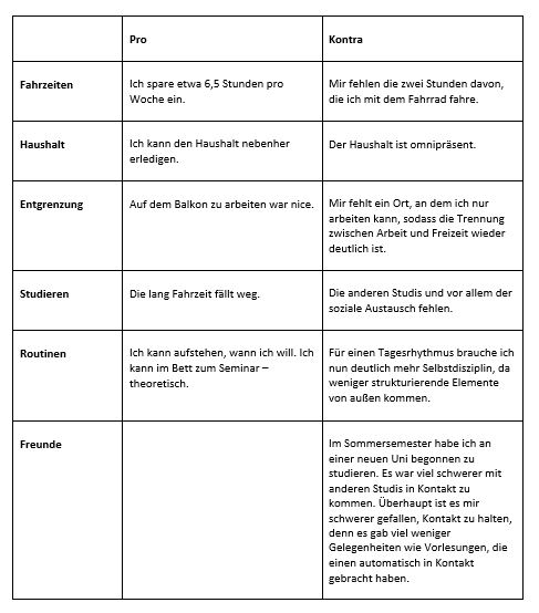 Was ich aus dieser Liste für mich mitnehme ist, dass zwar das überwiegende Arbeiten für das Studium von zu Hause irgendwie machbar ist, doch erleichert mir die räumliche Trennung von Arbeit und Freizeit auch die gedankliche Trennung, sodass ich bei Feierabend auch besser abschalten kann und währender der Arbeit konzentrierter bin. Arbeit und Freizeit in den gleichen Räumlichkeiteen zu vereinen und dies auf Dauer, ist eine ganz neue Herausforderung. Die durch Zufall der geplanten Kontakte zu Bekannten und Fremden fehlen: Gespräche vor oder während der Vorlesung, ein spontanes gemeinsames Mittagsessen, nach dem Weg fragen. Auf der anderen Seite fällt für mich viel Fahrzeit weg, was den Alltag entlastet.