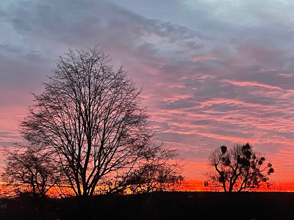 Ich öffnete die Schlafzimmertür und wurde von einem Sonnenaufgang verzaubert, der meiner momentanen Welt die Prioritäten wieder zuordnete. Gefesselt von einem glühenden Horizont, umsäumt von dunkelgefärbten Dächern und einem rosaroten Wolkenteppich über dem die Unendlichkeit schwebt, stand ich fassungslos vor dem Weltpanorama. Der Gedanke, dass ich zu spät kommen würde, verstummte.