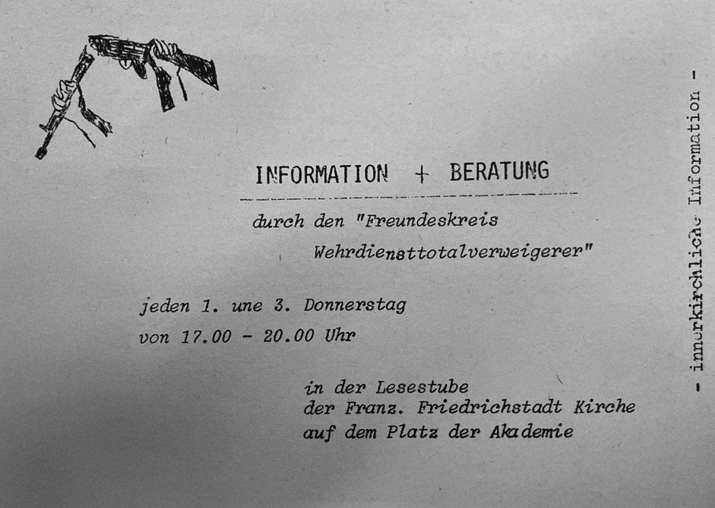 Ein weiteres zentrales Element des kirchlichen Widerstands waren die Friedensgebete, die sich ab Anfang der 1980er Jahren in mehreren ostdeutschen Kirchen etablierten. Dabei waren sie mehr als eine religiöse Veranstaltung – sie wurden zu politischen Versammlungen, die vor allem von jungen Menschen und kritischen Bürger*innen besucht wurden und einen weiteren Ort für Vernetzung schufen. In der Samariterkirche wurden die Friedensgebete und damit verknüpfte Friedenswerkstätte durch die Gruppe organisiert, die 1982 entstand und in der A.W. Mitglied war. Im Laufe der Zeit hat sich der Friedenskreis in zahlreiche Untergruppen und weitere Initiativen aufgegliedert.¹⁶ So war N.B. in dem Freundeskreis der Wehrdiensttotalverweigerer tätig, „der sich zur Aufgabe gemacht hatte, Menschen zu begleiten und zu unterstützen, die mit ihrem Gewissen haderten und nicht zur NVA [nationale Volksarmee] wollten“. Dabei stand für Wehdiensttotalverweigerer viel auf dem Spiel, da man in der DDR in der Konsequenz mit bis zu fünf Jahren Haft rechnen musste. N.B. und der Freundeskreis leisteten Beratungsarbeit, verteilten Flugblätter und unterhielten Kontakte zu Wehrdiensttotalverweigerern in der BRD. Sowohl N.B. als Privatperson, als auch die Samaritergemeinde an sich schlossen Friedensverträge mit diversen Gemeinden in West-Deutschland, in den Niederlanden, den USA sowie Norwegen und Schweden.¹⁷ Diese Friedensverträge wurden dann wiederum durch den engagierten Friedenskreis der Samaritergemeinde öffentlich gemacht.