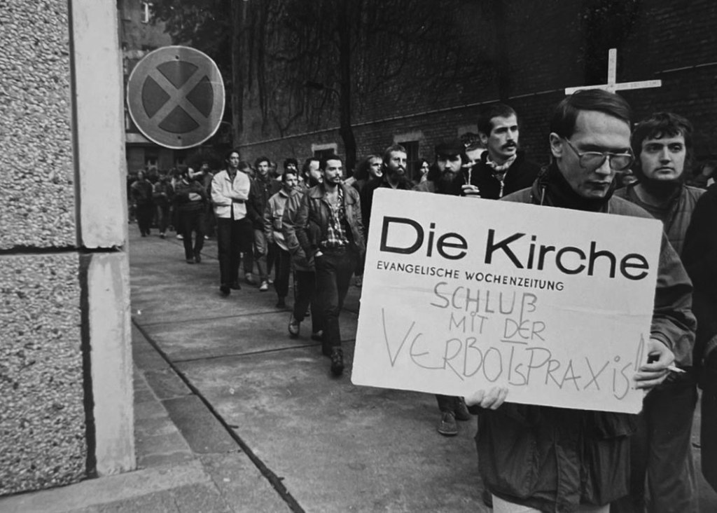 Das Verhältnis zwischen der DDR-Regierung und der evangelischen Kirche war von Widersprüchen geprägt: während die sozialistische Einheitspartei (SED) eine atheistische Gesellschaft anstrebte, blieb die Kirche eine der wenigen Institutionen, die sich dem direkten staatlichen Zugriff entziehen konnte. Doch dieser Status brachte zahlreiche Konflikte mit sich. Bereits in den 1950er Jahren versuchte der sozialistische Staat, den kirchlichen Einfluss zu schwächen. Christliche Jugendliche wurden von höheren Bildungswegen ausgeschlossen, und die Jugendweihe wurde als staatliche Alternative zur Konfirmation etabliert.¹ Mit der Verfassung von 1968 wurde die Kirche endgültig aus dem öffentlichen Raum verdrängt, sie verlor ihren institutionellen Einfluss und durfte sich nur noch als private Glaubensgemeinschaft betätigen. Dennoch konnte sie ihre Autonomie bewahren, da sie über eigene Ausbildungsstätten, Finanzierungsstrukturen und Entscheidungsorgane verfügte.² M.R. erinnert sich: „Ich bin seit der ersten Klasse in die Christenlehre gegangen, weil der Religionsunterricht ja nicht an der öffentlichen Schule stattfinden durfte. Also Religion wurde sozusagen in den privaten Bereich, oder in den Gemeindebereich verdrängt.“ Trotz staatlichen Drucks und eines stetigen Mitgliederschwunds blieb die evangelische Kirche ein wichtiges gesellschaftliches Korrektiv. 1989 gehörten ihr noch etwa 4,4 Millionen Mitglieder an, die in 6.200 Gemeinden organisiert waren und von rund 4.000 Geistlichen betreut wurden.³
